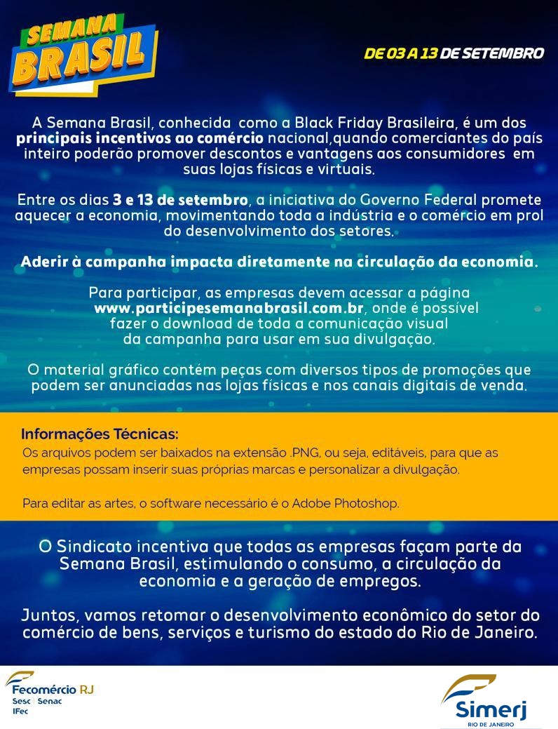 As datas comemorativas estão auxiliando a retomada das atividades econômicas no estado do Rio de Janeiro. Muito aguardada pelos empresários, a Semana Brasil – também conhecida como a Black Friday brasileira -, tem início na próxima quinta-feira (dia 03) e segue até 13 de setembro.