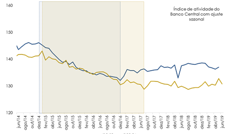 O percentual de otimistas é o maior desde o início da pesquisa em fevereiro de 2019.Podem ter contribuído para o aumento do otimismo i) o tamanho do PIB brasileiro no segundo trimestre de 2019 divulgado pelo IBGE (+0,4% contra o trimestre imediatamente anterior ante previsão do mercado de 0,2%), que impactou de forma positiva a perspectiva do mercado para o crescimento anual do PIB (mediana igual a 0,87% ante 0,81% na semana passada); ii) a liberação dos saques do FGTS; iii) a perspectiva de afrouxamento da política monetária e iv) Semana Brasil. Reunidas, (ii), (iii) e (iv) estimularão o consumo privado e por conseguinte as vendas dos empresários do setor, ajudando na recuperação ainda muito lenta da produção brasileira e fluminense (gráfico abaixo).