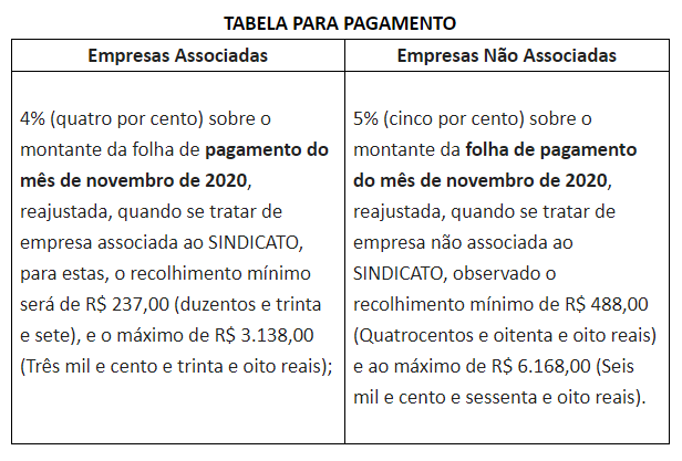 e que estabelece a obrigação de recolhimento da contribuição para todas as empresas do Comércio Varejista de Material Elétrico, Eletrônicos e Eletrodomésticos do Rio de Janeiro, com o vencimento 10 de dezembro de 2020, conforme tabela abaixo.