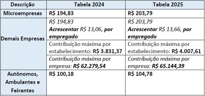 O valor a ser cobrado consta da tabela abaixo, respeitando os valores discriminados, conforme o porte da empresa representada.