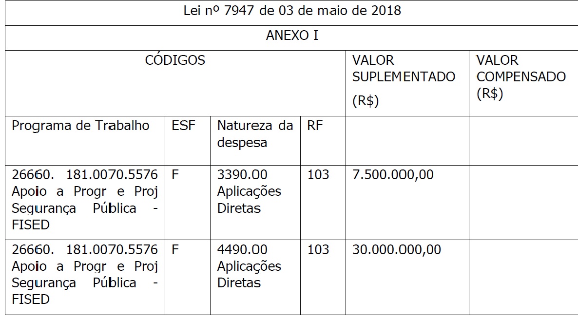 Art. 2.º O Anexo I, da Lei nº 7.947, de 03 de maio de 2018 passa a vigorar com a seguinte redação: